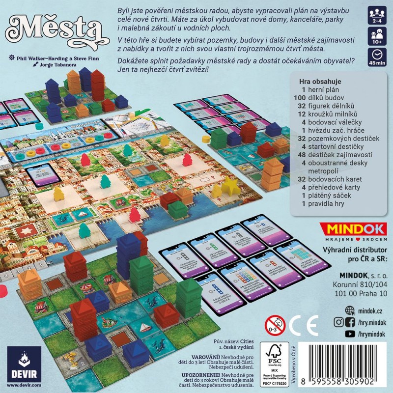 Města jsou strategická hra pro 1-4 hráče, ve které se stáváte architekty moderních čtvrtí. Vaším úkolem je chytře vybírat pozemky, budovy a zajímavosti, abyste vytvořili harmonické a prosperující prostředí.