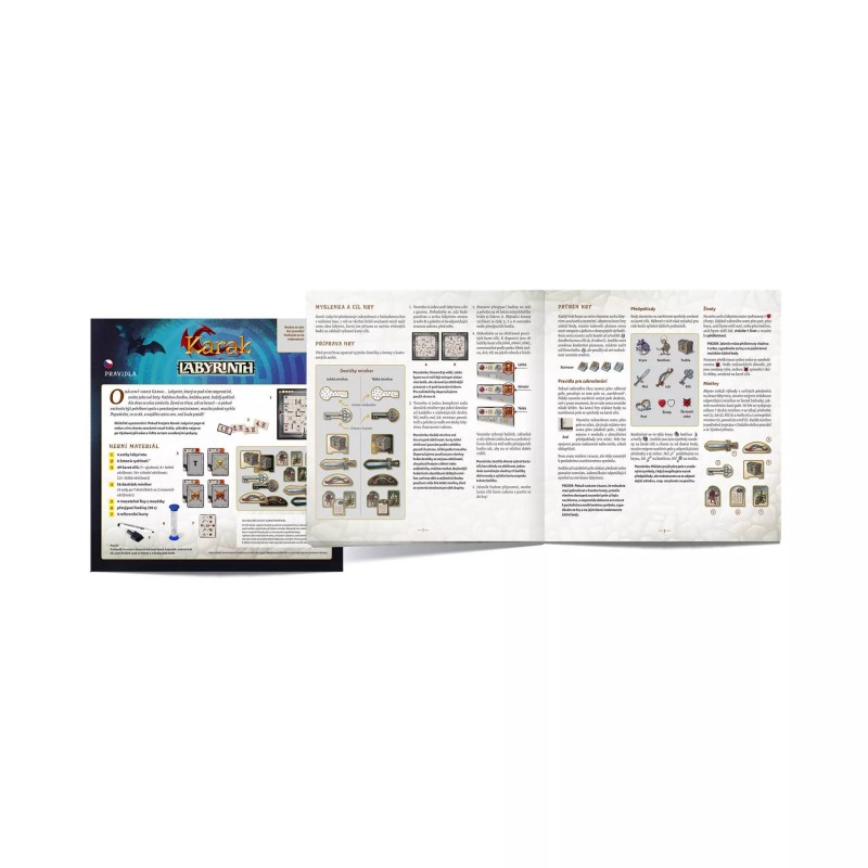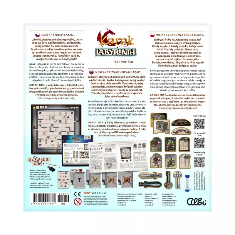 Hra Karak: Labyrinth obsahuje: 4 oboustranné popisovací archy labyrintu, 4 mazatelné fixy, 56 popisovacích dílků minihher, 49 karet úkolů, 1 přesýpací hodiny (30s), 8 žetonů rychlosti, 4 přehledové karty, pravidla v českém, slovenském a polském jazyce.