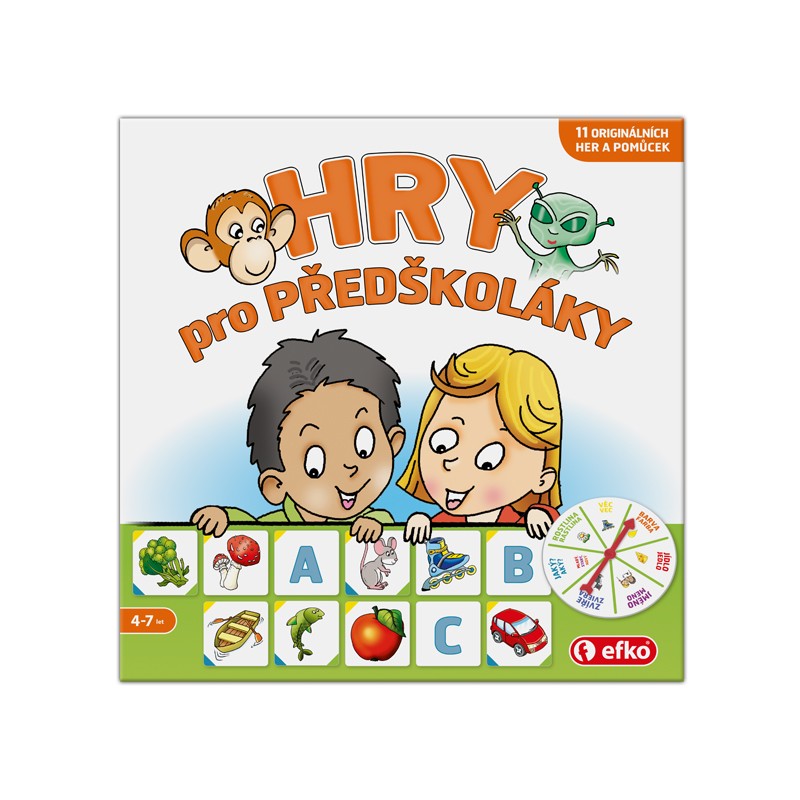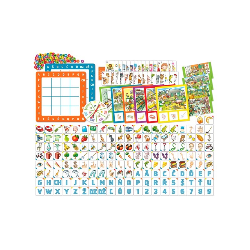Abeceda – hra pro 2–8 hráčů, během které děti hledají obrázky začínající na náhodně zvolené písmenko abecedy. Princip hraní přímo vybízí k využití jazykové pestrosti češtiny a slovenštiny, kdy všechna písmena abecedy obou jazyků jsou součástí balení. Děti tak mohou tu samou kartičku použít pro vícero písmen. Např. kartičku s obrázkem lodičky lze pojmenovat také jako plavidlo, kocábku apod.