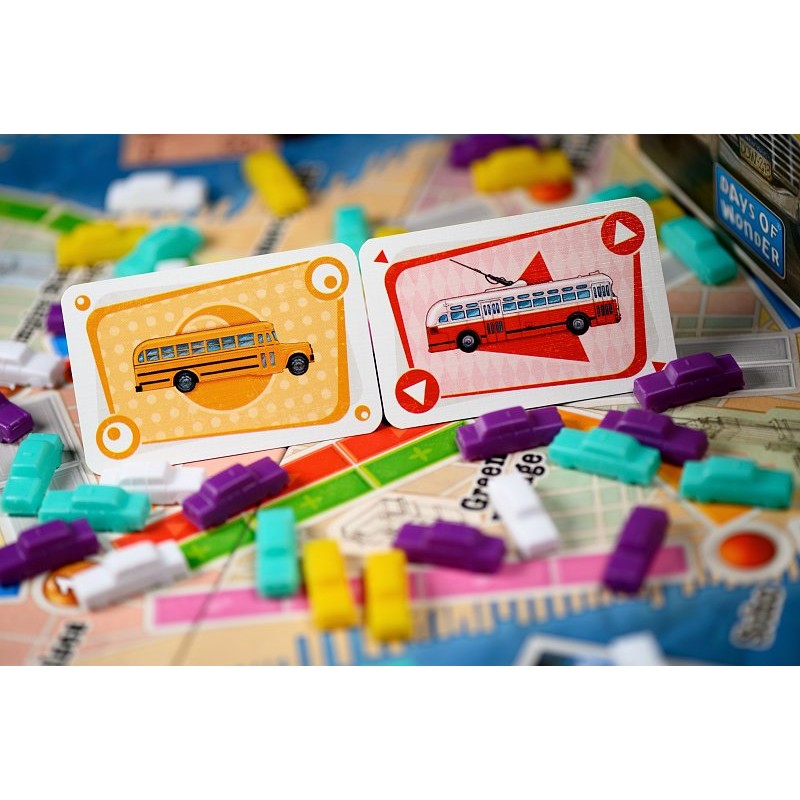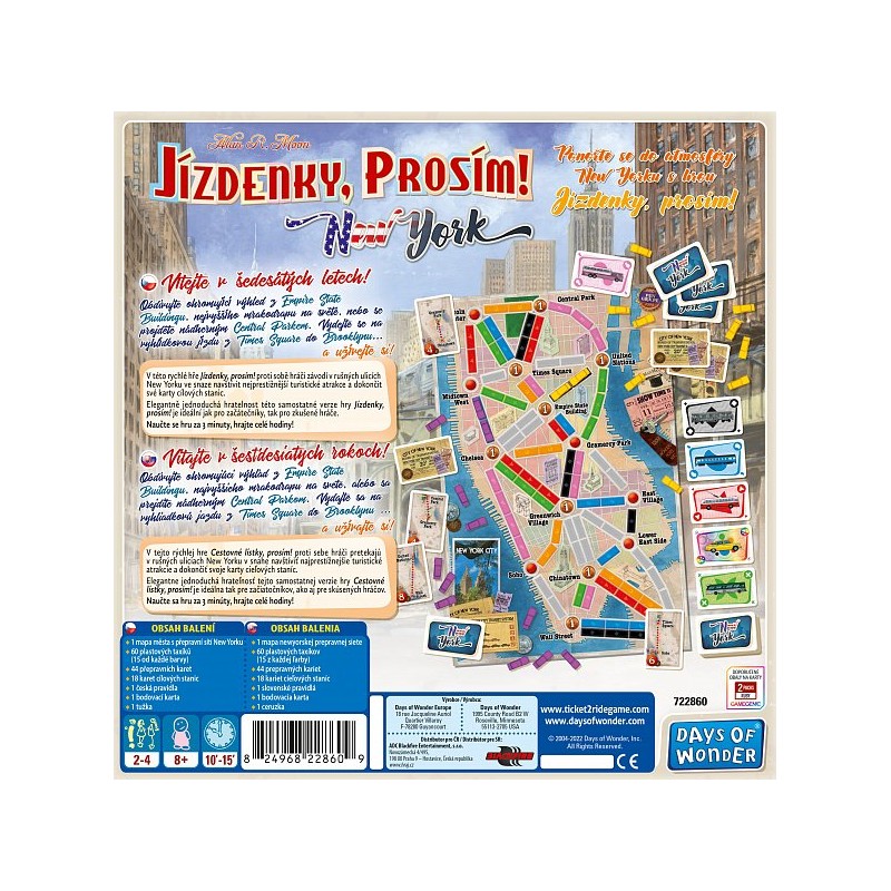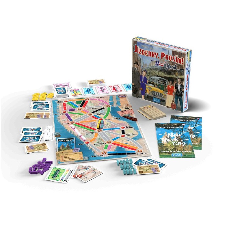 V této rychlé hře Jízdenky, prosím! proti sobě hráči závodí v rušných ulicích New Yorku ve snaze navštívit nejprestižnější turistické atrakce a dokončit své karty cílových stanic. Elegantně jednoduchá hratelnost této samostatné verze hry Jízdenky, prosím! je ideální jak pro začátečníky, tak pro zkušené hráče. Naučte se hru za 3 minuty, hrajte celé hodiny!