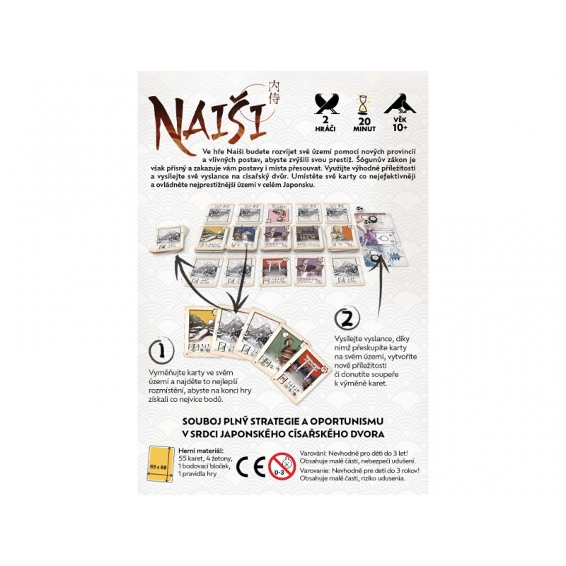 Ve hře Naiši budete rozvíjet své území pomocí nových provincií a vlivných postav, abyste zvýšili svou prestiž. Šógunův zákon je však přísný a zakazuje vám postavy i místa přesouvat. Využijte výhodné příležitosti a vysílejte své vyslance na císařský dvůr. Umístěte své karty co nejefektivněji a ovládněte nejprestižnější území v celém Japonsku.