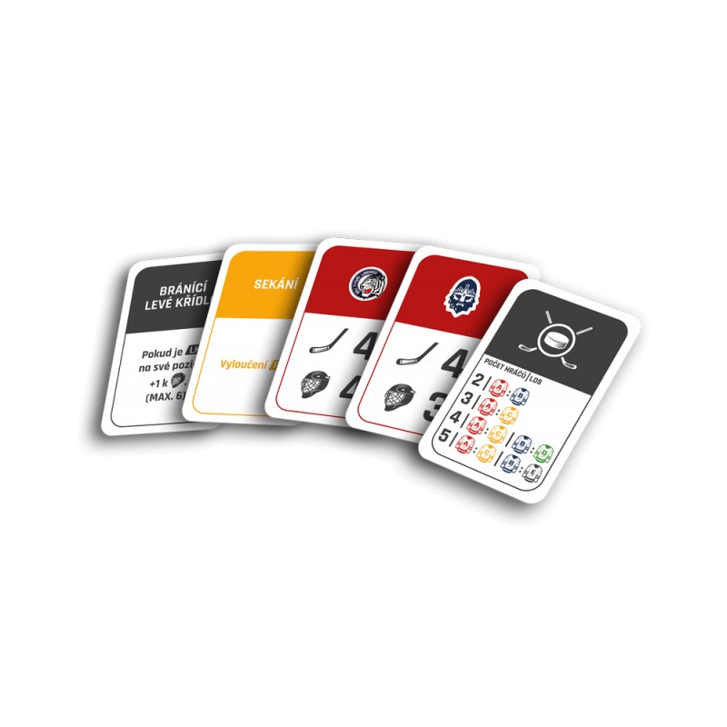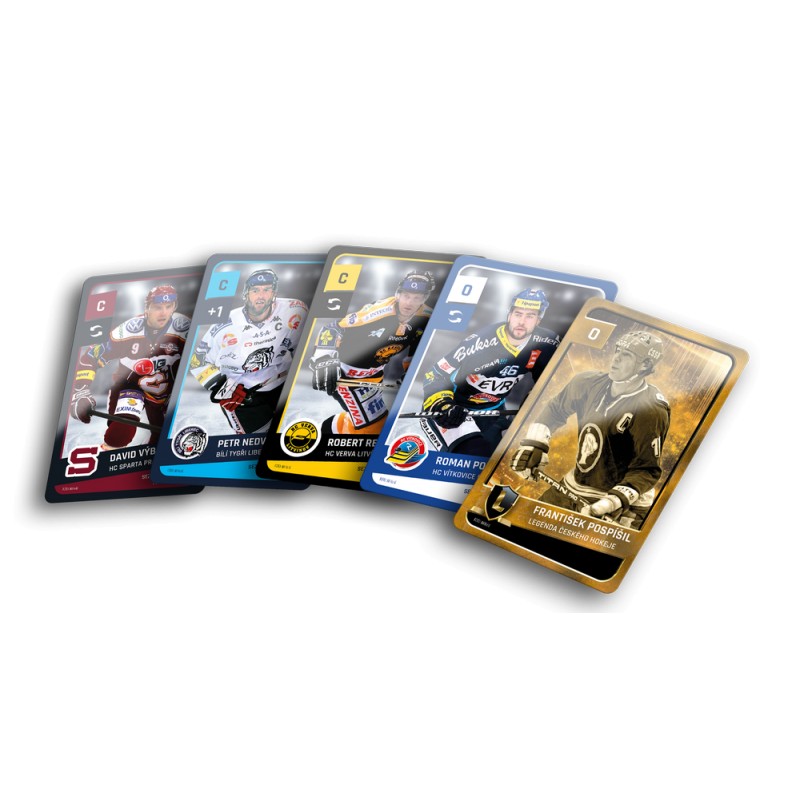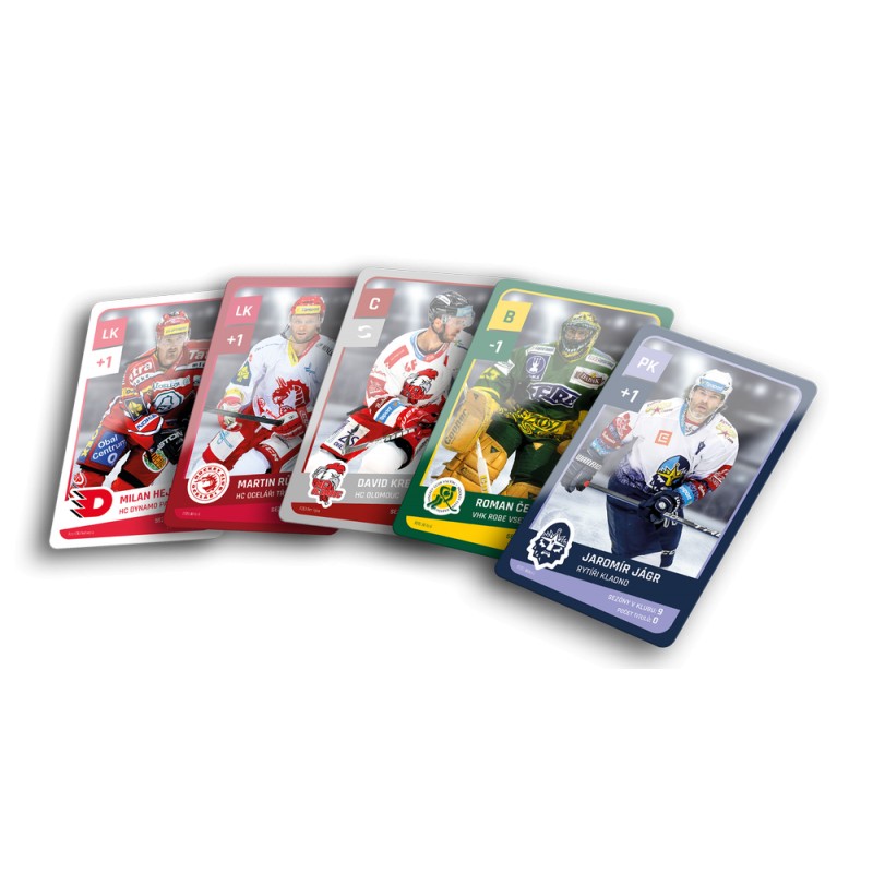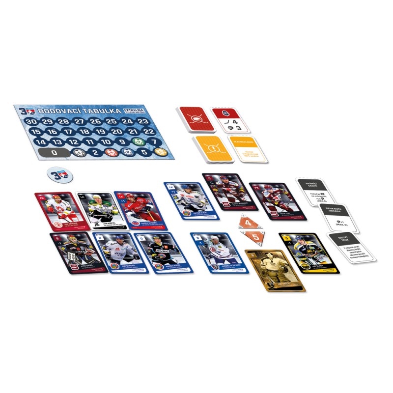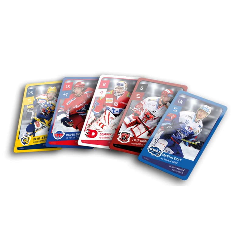 Ve hře najdete 6 karet hokejistů (centr, levé křídlo, pravé křídlo, 2 obránci, brankář) z každého ze 14 klubů, které odehrály extraligovou sezónu 2022/2023 + 3 dalších týmů, které ve třicetileté historii Extraligy získaly titul a navíc 8 karet legend předextraligové éry. Na kartách najdete pozici hráče, klubovou příslušnost, kolik let strávil v Extralize v daném klubu a kolik s ním získal titulů. Dva hráči z každého klubu maní navíc přiřazenou speciální schopnost, díky které mohou během zápasů manipulovat s kostkami.