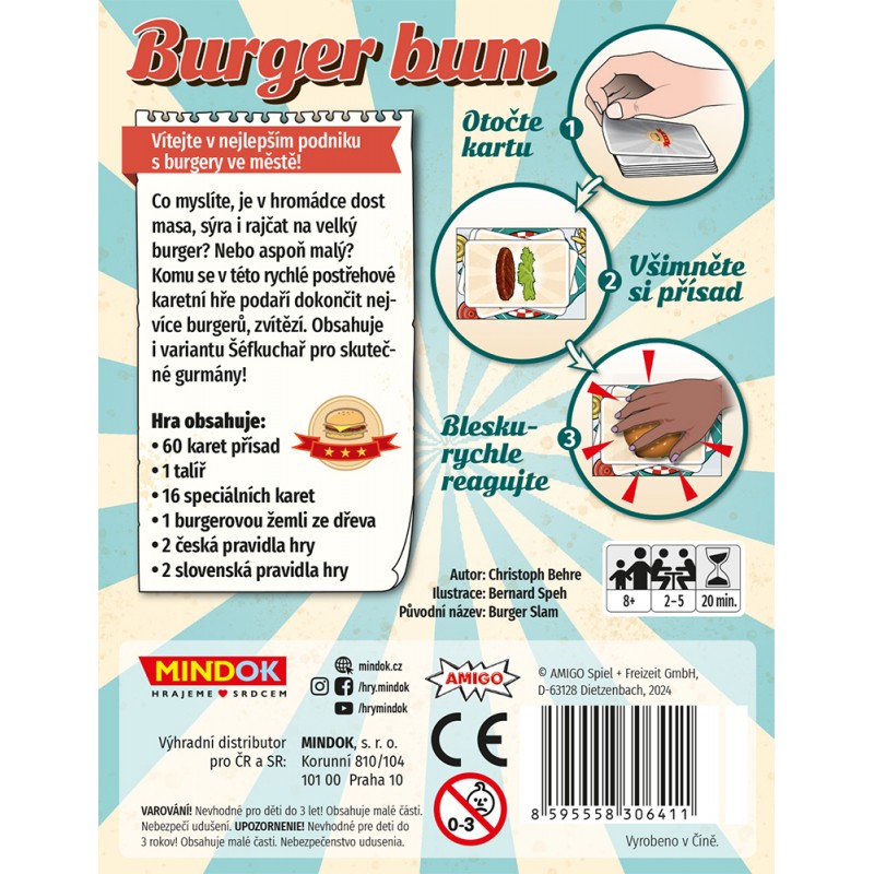 Staňte se mistrem rychlého skládání burgerů ve svižné karetní hře Burger Bum. Skládejte burgery na talíř a buďte první, kdo správně rozpozná, kdy je hotovo, chňapne žemli a dokončí kolo. Vyhrává ten, kdo má na konci hry nejvíce karet ve svém balíčku. Podaří se vám porazit ostatní kuchaře a vydělat si na nejvíce zakázkách?