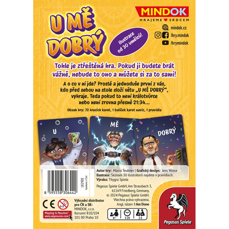 U mě dobrý je bláznivá karetní hra, ve které zvítězí ten, kdo jako první složí na stole kouzelnou frázi! Připravte se na rychlou a chaotickou zábavu, kde se pravidla neberou příliš vážně. Hra je určena pro 2 až 5 chaotických hráčů a je vhodná od 8 let.