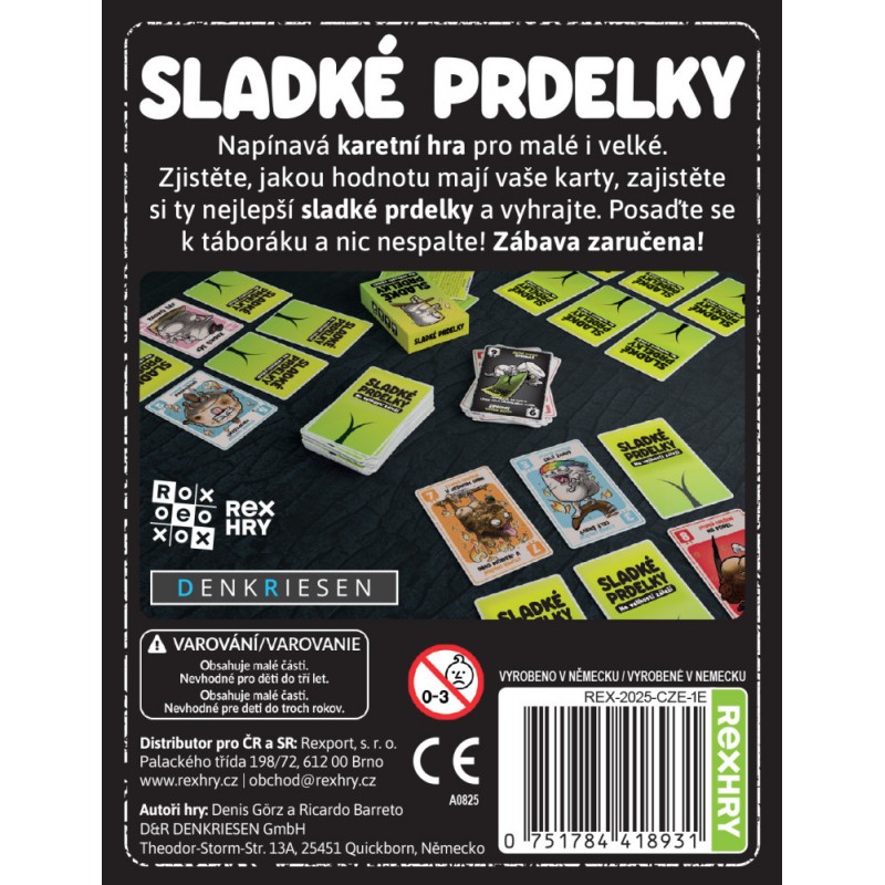 Sladké prdelky jsou rychlá a nenáročná karetní hra s vtipnými ilustracemi. Hráči postupně získávají informace o kartách, které mají před sebou vyložené, nahrazují je a vyměňují s ostatními hráči tak, aby na konci kola měli karty s co nejmenším součtem. Na velikosti totiž záleží! Dobírané karty lze také zahrát pro jejich speciální schopnosti. Díky nim se můžete podívat na karty soupeřů, měnit je a přesunovat nebo třeba odehrát tah navíc. Když si myslíte, že máte před sebou nejmenší součet karet, stačí zvolat „Sladké prdelky“ a spustí se konec kola. Poté, co ostatní hráči odehrají poslední tah, se body spočítají. Jinak se hraje na šest kol a vítězem se stává ten, kdo má poté nejnižší součet. Pamatujte si, co máte za karty, blafujte a zatopte svým spoluhráčům!