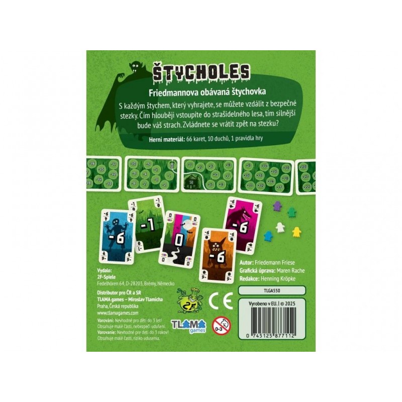 Štycholes je jednoduchá štychová hra bez trumfů. Štych vyhrává nejvyšší karta v zahrané barvě. Snadné, že? Trik je v tom, že jsou ve hře jak karty s kladnými hodnotami, tak těmi zápornými. Hrajete s kartami od „-6“ do „+6“ ve 4 barvách. Takže sbíráte kladné i záporné karty a vaším cílem je dosáhnout co nejvyrovnanějšího výsledku. Toho by mohli dosáhnout všichni hráči… jaká škoda, že hrajete proti sobě. Ostatní se už nemohou dočkat, až vám zavaří další dávkou bodů. Hodně zábavy při hraní Štycholesu!