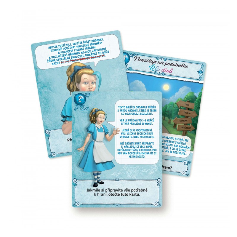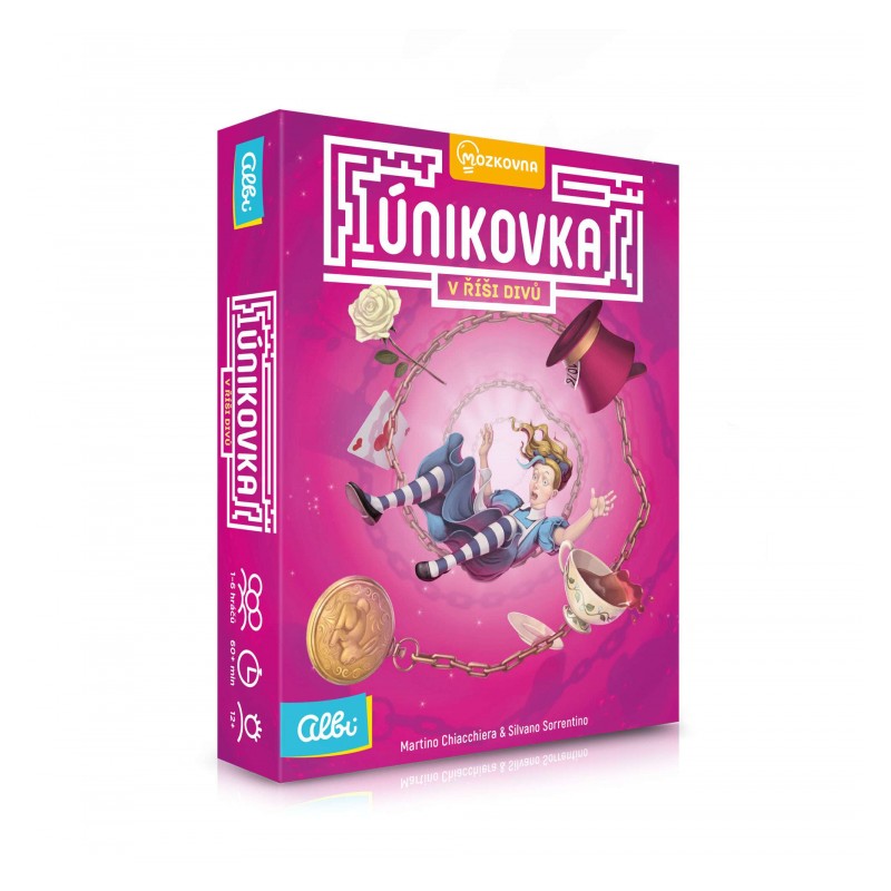 Únikovka V Říši divů je karetní variací na populární únikové hry, při nichž se skupina přátel zamkne do místnosti plné rébusů a snaží se z ní v časovém limitu uniknout pryč. Únikovka je plná nástrah, které musíte vyřešit, chcete-li uspět. Buď všichni vyhrajete, nebo společně selžete.