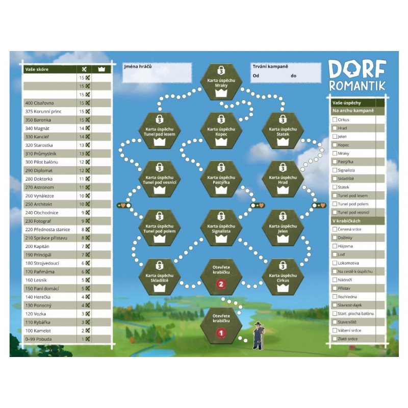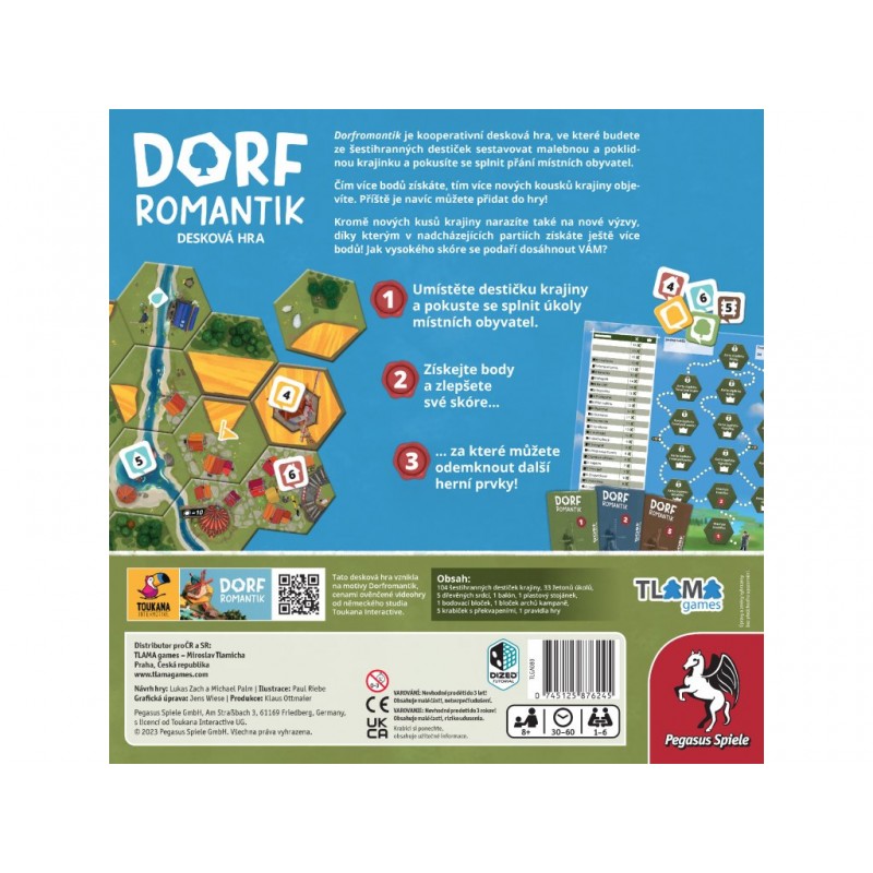 Dorfromantik je kooperativní desková hra, ve které budete ze šestihranných (hexových) destiček sestavovat malebnou a poklidnou krajinku a pokusíte se plnit přání místních obyvatel v podobě vybudovaných polí, vesnic a lesů, řek a železnice určitého rozsahu. Zároveň získáte body za výstavbu co nejdelší tratě a také za nejdelší řeku. Vlajky vám přinesou body v uzavřených oblastech. Čím více bodů získáte, tím více nových kousků krajiny objevíte. Příště je navíc můžete přidat do hry!