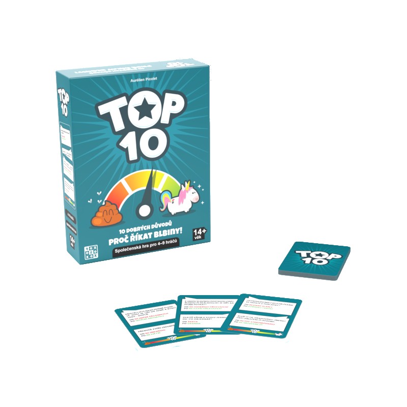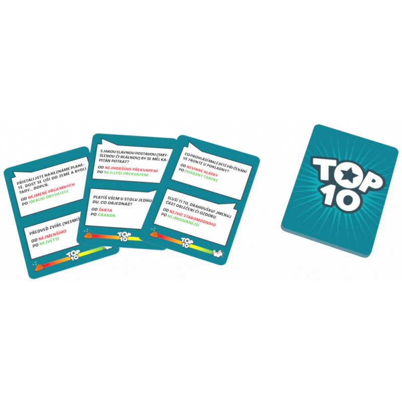 TOP 10 je párty hra, kterou si zahrajete vážně s každým! Hra obsahuje celkem 500 různých zadání (slovních a pantomim). Jeden z hráčů je kapitán, přečte nahlas úkol a ostatní hráči musí odpovědět nebo předvést svou reakci na základě karty, kterou tajně dostali (karty jsou od 1-10 a představují škálu od nejhoršího po nejlepší). Kapitán následně musí odpovědi správně seřadit od nejhorší po nejlepší, přičemž za každou chybu tým ztrácí jeden život. Cílem je projít pět kol s co nejmenší ztrátou životů. TOP 10 je troško ulítlá párty hra, kterou si ale se správnou skupinkou pořádně užijete!