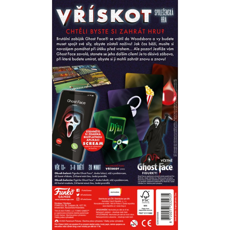 Vřískot je kooperativní hra, která se odehrává v reálném čase. To znamená, že hráči závodí s Ghost Facem, aby zůstali naživu – což jak asi tušíte není ta úplně nejvhodnější chvíle dát si popcorn. Spolupracujte a snažte se hrát co nejrychleji, abyste si dobrali a vyměnili karty, které potřebujete. Pokud se vám podaří vyřešit všechna místa činu před vypršením času a zabitím některého z hráčů, všichni se stanete vítězi hry!