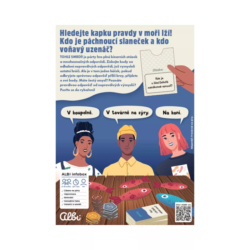 Párty hra plná blafování, bizarních otázek, výmyslů a hledání odpovědí, které nejvíce smrdí. Dokážete odhalit nepravdivé odpovědi?