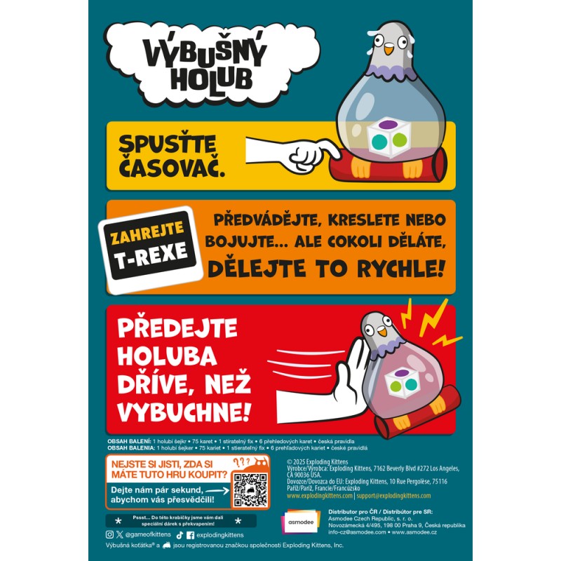 Výbušný holub je ideální pro rodinné večery, partičky přátel i zábavu na oslavách. Hra je určená pro 3 a více hráčů od 7 let a na jednu partii byste si měli vyhradit zhruba 10 minut. Nejlépe funguje ve dvou týmech, ale pravidla počítají i s variantou pro tři jednotlivce. Zvládne ji každý, kdo se nebojí trochu ztrapnit při šarádách, umí rychle přemýšlet a má smysl pro humor.