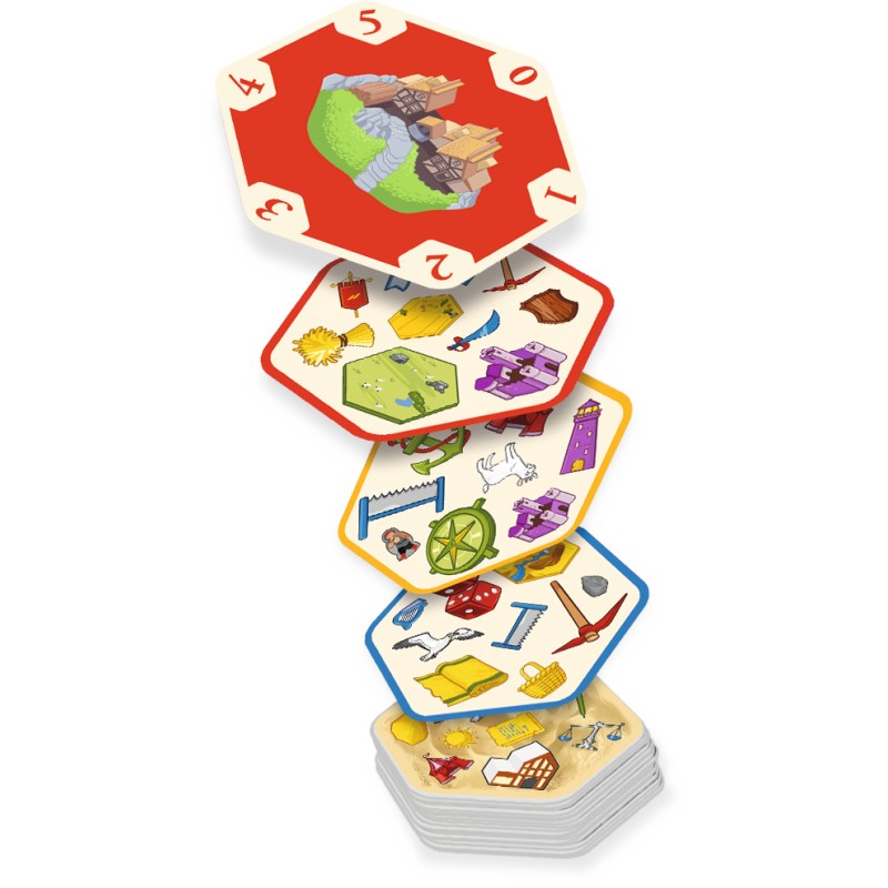 Abyste mohli zahrát kartu, musíte být první, kdo na ní najde a pojmenuje symbol, který se shoduje se symbolem na jedné z již zahraných karet. Zábavná a rychlá hra DOBBLE CATAN je nezbytnou party hrou pro fanoušky CATANu!