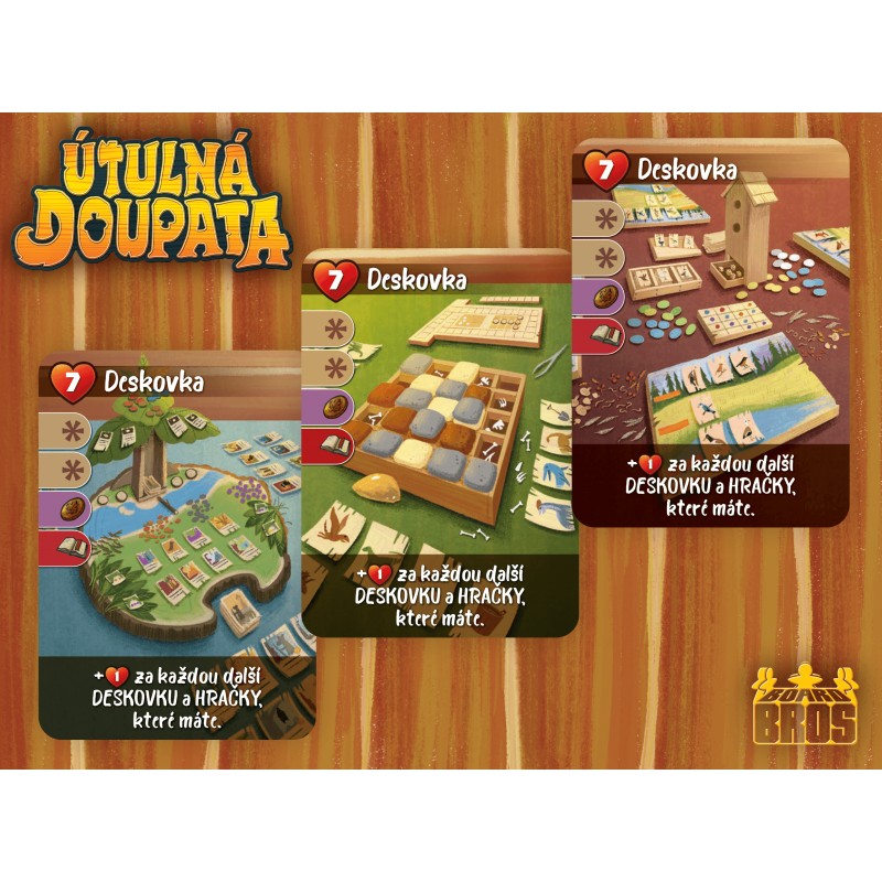 Poslední sníh sotva roztál, ale lesní zvířátka vědí, že se musí pěkně ohánět, aby byla připravena na další zimu. Ve hře Útulná doupata, jež kombinuje worker a dice placement, se stanete patronem zvířecí rodinky, kterou čeká spousta práce. Budete sbírat dřevo a houby, těžit kamení, vyrábět užitečná udělátka a především zvelebovat váš příbytek knížkami, houpacími křesly, lahodnými zavařeninami a dalšími kartami potěšení. Pokud se vám nepodaří zvířátkům přidělit správné kostky, do příště se poučí a práce jim půjde lépe od ruky. Vyhraje ten, kdo má na konci hry nejútulnější doupě!