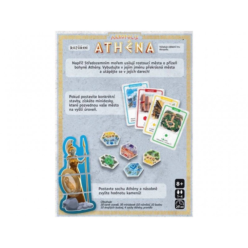 Akropolis: Athéna je rozšíření základní hry Akropolis, zasazené do starověkého Středomoří, kde se architekti snaží vybudovat prestižní města. Téma se točí kolem získání přízně Athény, bohyně moudrosti, války a řemesel, aby získali bohatství a čest.