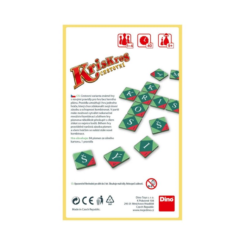 Dochází vám na cestách slova? Najděte si nová s cestovní verzí populární hry Kris Kros. Nepotřebujete k ní žádný herní plán a můžete se s ní zabavit i sami. Když ale přizvete kamarády, odkryjí se vám nekonečné možnosti kombinování a přeskupování písmen. V průběhu hry bude navíc pravidelně narůstat písmenková zásoba.