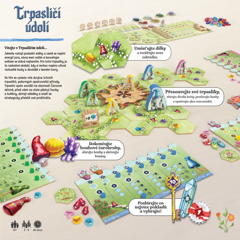 Ve hře se ujmete role dvojice lučních trpaslíků, pokorných opatrovníků přírody. Trpaslíci spolu soutěží na slavnosti Čarovné sklizně, před vámi na stole pěstují houby a květiny, sbírají odměny a snaží se strategicky přelstít své protihráče.