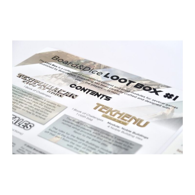 Loot Box je sbírka propagačního obsahu a malých modulů pro několik her vydaných společností Board&Dice. Vše bylo pečlivě vytvořeno a navrženo s ohledem na vás - hráče.