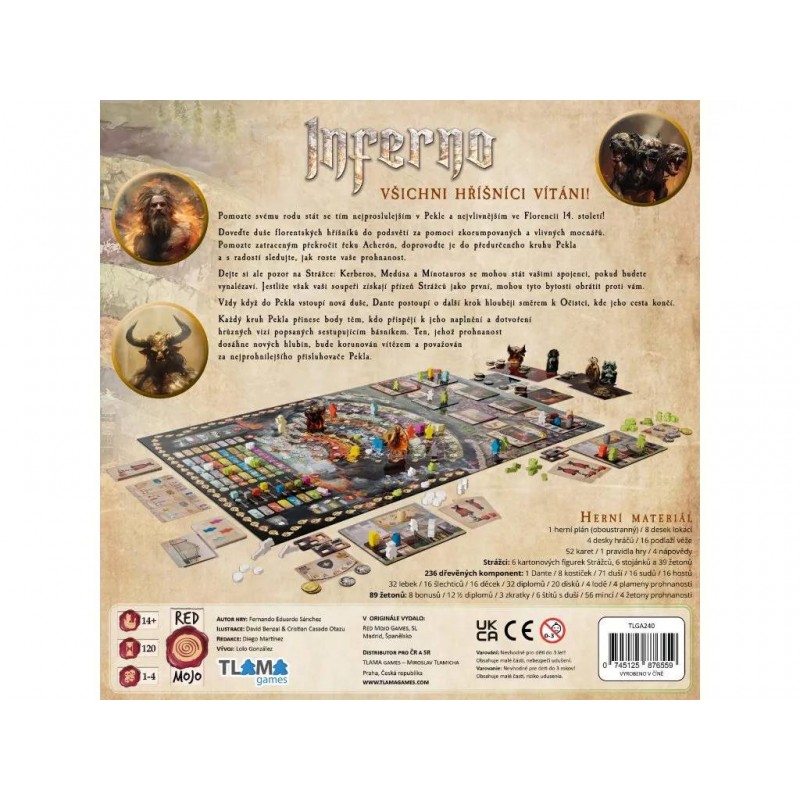 Inferno (české vydání) je strategická hra inspirovaná Božskou komedií Danta Alighieriho, ve které povedete svůj rod ve snaze stát se co nejlepšími přisluhovači pekla. Toho dosáhnete sbíráním bodů prohnanosti. Ty získáte především za to, že dovedete hříšníky do příslušných kruhů v pekle. V průběhu hry se budou hráči střídat na tahu po směru hodinových ručiček, dokud Dante nezapříčiní konec hry. Herní plán se skládá ze dvou částí: jedna zobrazuje všech 9 kruhů pekla a rejstřík duší, zatímco druhá představuje Florencii na počátku 14. století, kde Dante žil, s jejími mocenskými hrami a palácovými intrikami.