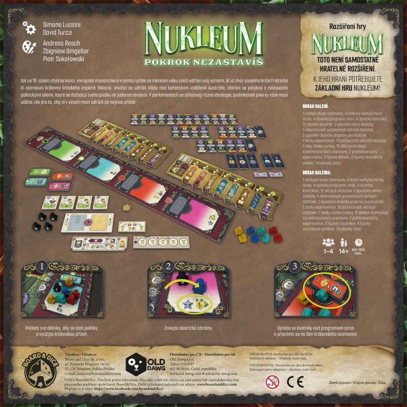 Druhé rozšíření ke skvělé heavy euro hře Nukleum, které přinese novou mechaniku politických stran, která jednak přidává element area majority, druhak výrazně vylepšuje a posiluje efekt Dne královského oceňování. Navíc přinese dva nové experimenty, nové akční dílky a kontrakty. Vše krom bočnic krabice je lokalizované (polep přední i zadní strany, pravidla, nápovědní karty).