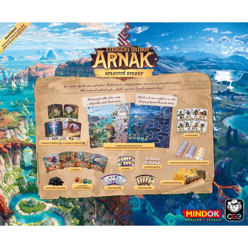 Připravte se na ultimátní výpravu do světa Ztraceného ostrova Arnak! Spletité stezky je dosud největší rozšíření, které přináší oboustrannou herní desku, větší než v základní hře, s dvěma zcela novými výzkumnými stopami a unikátními mechanismy.