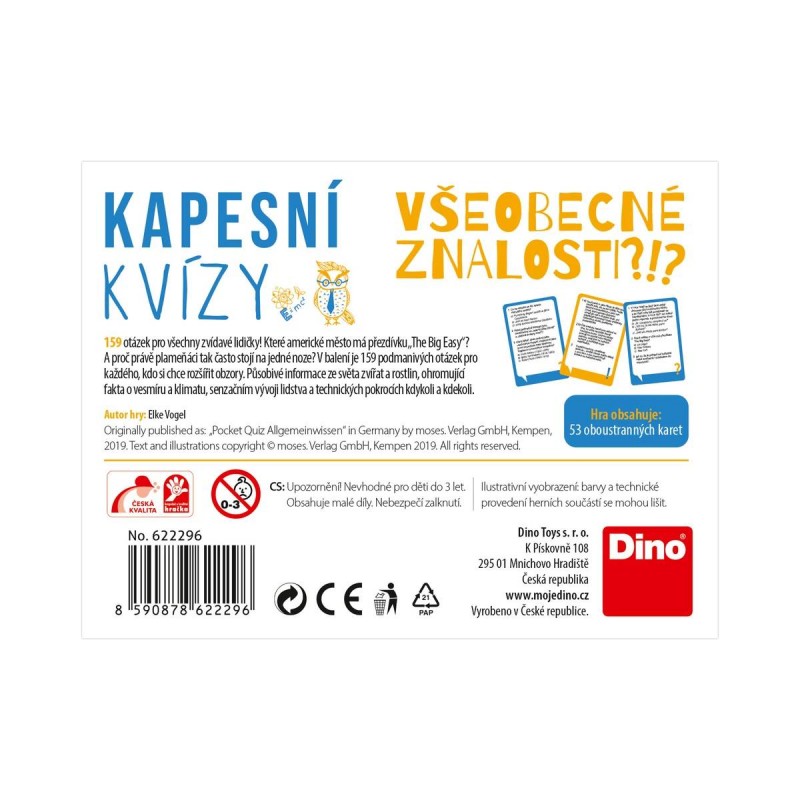 Umí surikata štěkat? Jsou vaše znalosti vesmíru nekonečné stejně jako on? A proč plameňáci postávají na jedné noze? Rozšiřte si obzory zábavnou vědomostní hrou, kterou díky kapesnímu formátu můžete vzít, kamkoli vás napadne! K dispozici budete mít 159 otázek a odpovědí na téma příroda, vesmír i samotné lidstvo a jeho vývoj.